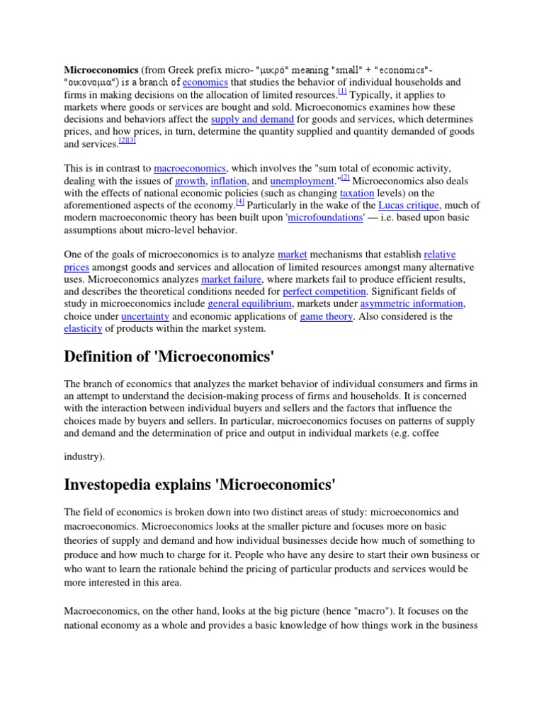 Micro or Macro: The unemployment rate is holding steady at 7.2%. Macroeconomics. Micro or Macro: Congress should lower taxes to allow consumers to keep more of their income. Macroeconomics. Micro or Macro: Colleges should lower the tuition for freshmen and sophomores. Microeconomics. Micro or Macro: The price of cars is rising in spite of a ... ADVERTISEMENTS: Read this article to learn about micro economics, macro economics and their difference. Microeconomics: Microeconomics is the observe of macroeconomics. It is the analysis of the economy's constituent elements—'Micro', of course, being Greek for 'small'. As the name suggests, it is not aggregative but elective; it seeks to explain the working of markets for […]